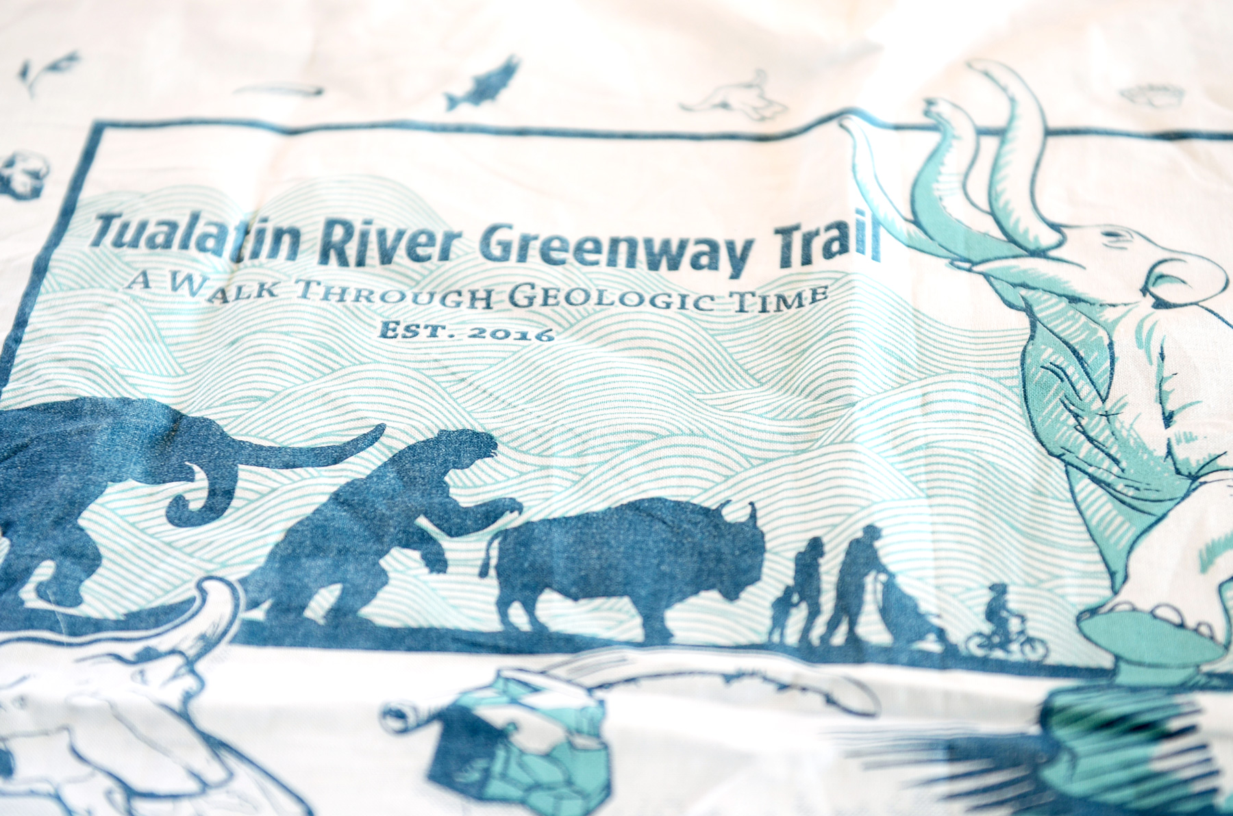 This bandana was crafted for a hand out during the grand opening of the Tualatin River Greenway Trail. Artwork includes a map of where the trail is in relation to the city, and flora and fauna found along this interpretive geological walk through time.